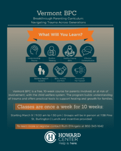Vermont BPC is a free 10 weeklong course for parents who have been (or are at risk of) being involved with the child welfare system. It educates parents about the impact of trauma on themselves and their children, while providing information, skills and strategies for understanding, healing, hope and growth.
